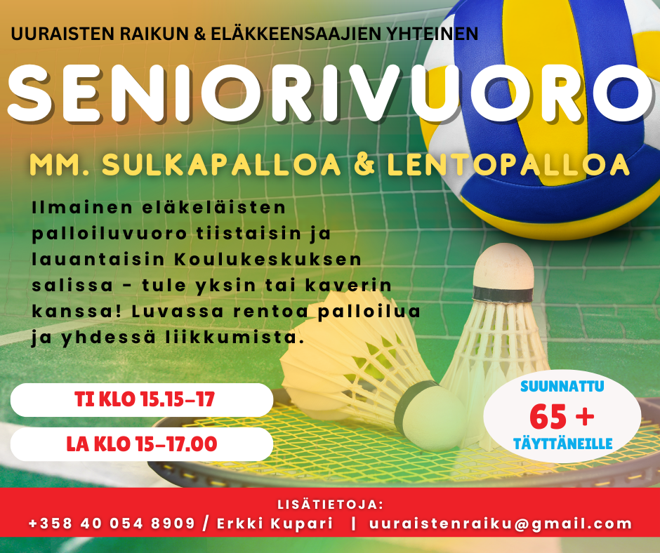 Senioreiden oma ILMAINEN palloiluvuoro johon kaikki ovat tervetulleita tasosta riippumatta! Omia välineitä ei tarvitse, Raiku tarjoaa lentopallot käyttöön ja sulkapallomailat ja -pallot löytyvät koululta. Tervetuloa liikkumaan!