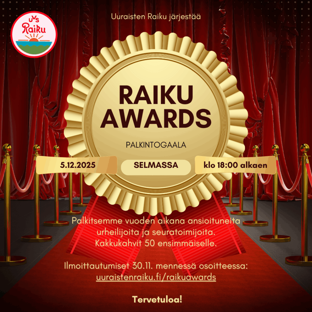Uuraisten Raiku palkitsee vuoden 2025 aikana ansioituneita urheilijoita sekä seuratoimijoita Raiku Awards-gaalassa Uuraisten Selmassa 5.12.2025 klo 18:00 alkaen. Tapahtumaan on vapaa pääsy mutta ilmoittautuminen vaaditaan. Palkitut kutsutaan gaalaan erikseen.
